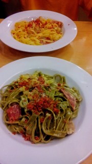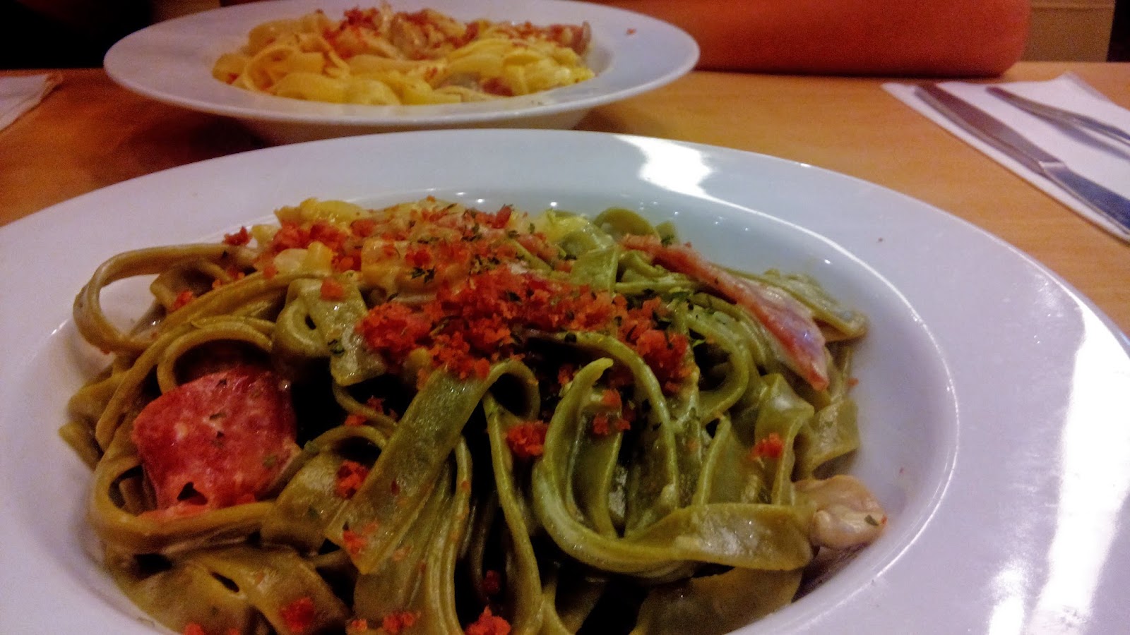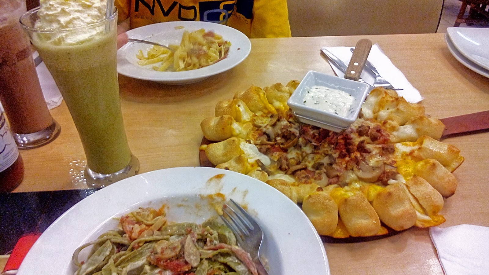 Nah, ceritanya aku dan si koko pesan menu paket untuk berdua nih. Harganya cuma IDR 76.000,- sudah dapet 2 menu utama + 1 hidangan pembuka + 2 minuman. Menu utamanya bisa pilih mau personal pan pizza, pasta, atau nasi. Kalau kita sih pilihnya 1 pizza + 1 pasta, memang ke sini niatnya gegara aku ngidam pizzanya sih huehehe.